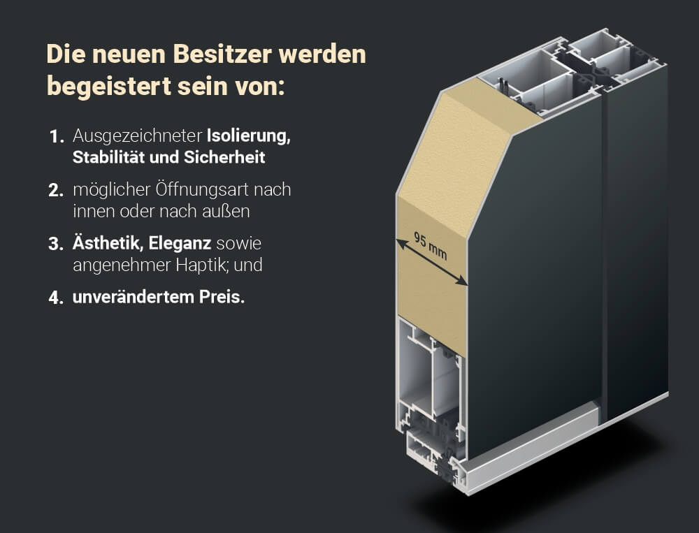 Unsere Haustüren zeichnen sich durch überdurchschnittliche Profilstärke, eine Dreifachverglasung, zusätzliche Dichtungen und eine perfekte Wärmedämmung aus. Sie sind verformungsstabil und die Schwellen aus Aluminium mit Zugluftstopper verringern den Wärmeaustausch.